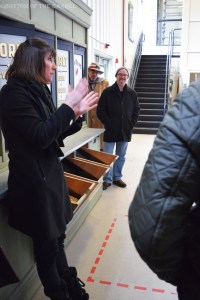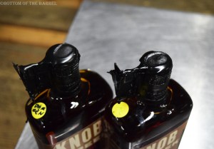 Outside the Knob Creek Single Barrel bottling house, we had the opportunity to theif some from the barrel and taste it. Mighty good as always, especially in the bitter cold of that day! Once inside and a bit warmer, we had the chance to bottle our own Knob Creek Single Barrel 120 proof. We picked our empty bottle, washed it ourselves on the “bourbon fountain” (they don’t use air or water so as not to blow in impurities/dust or lower the proof), then put a sticker on it with our name and sat it on the line to get filled, corked, and labeled. Watching it proceed down the line and knowing it’ll be your own personal bottle was more than a bit exciting, especially since we both love Knob Creek Single Barrel. At the end, as it comes off the line freshly labeled, a worker dips the top in black wax and impresses the circumferential seal. He then dips the very top in the wax again, at which point you can put your thumb print in it if you so desire–a nice personal finishing touch. After the tour, the bottles are waiting for you in the gift shop with your name sticker on it for picking up.